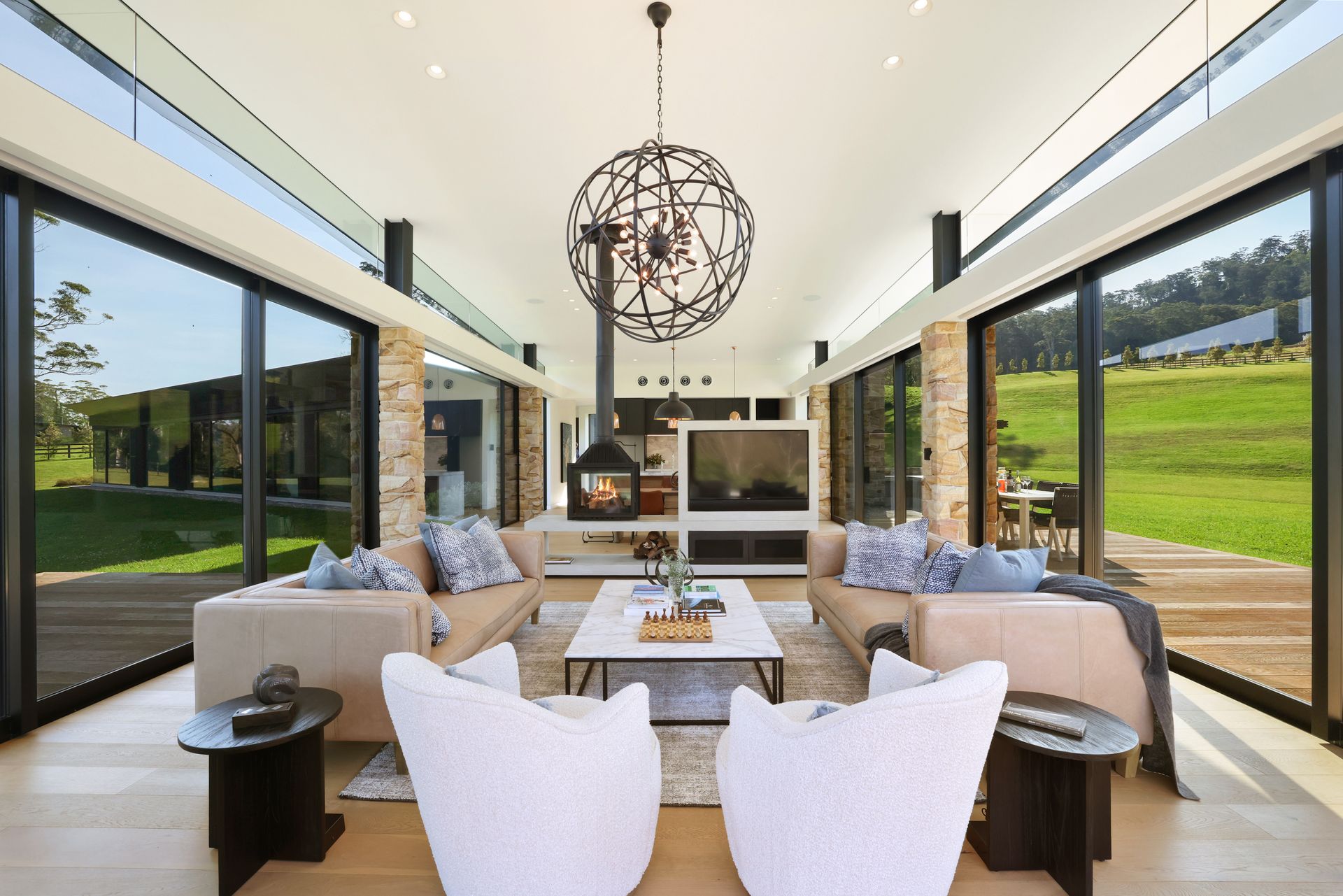 In the main living area you will find a gourmet kitchen, complete with Italian marble benchtops, high end appliances, a butler's pantry with a wine fridge and a coffee machine. The dining and living areas are separated by a double-sided combustion fire. The kitchen, living and dining area features floor to ceiling glass walls to make the most of the beautiful surroundings.